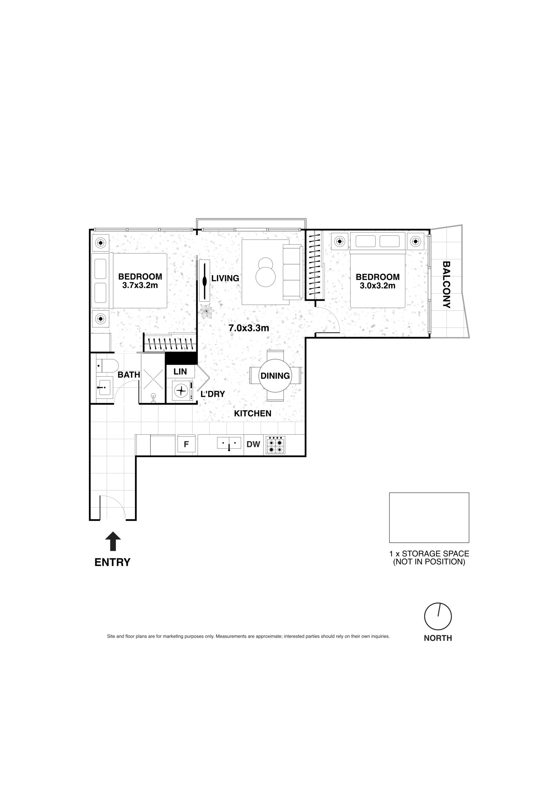 Both bedrooms are well-proportioned with built-in robes, while the sleek central bathroom is finished with modern fittings and a clean, elegant design. Comfort is assured with heating and cooling throughout. Adding to its appeal, the apartment also includes a secure storage cage, a valuable feature rarely found in city apartments.